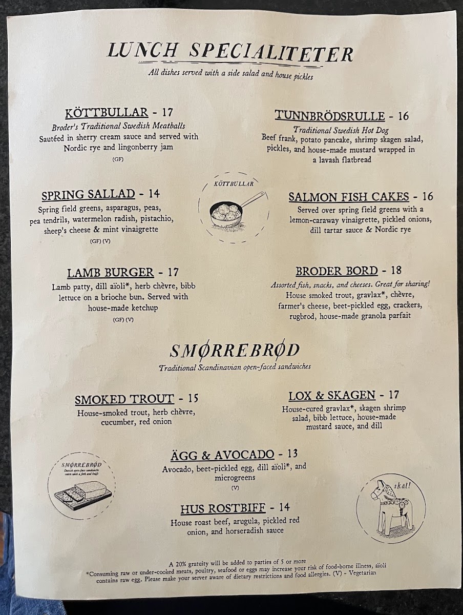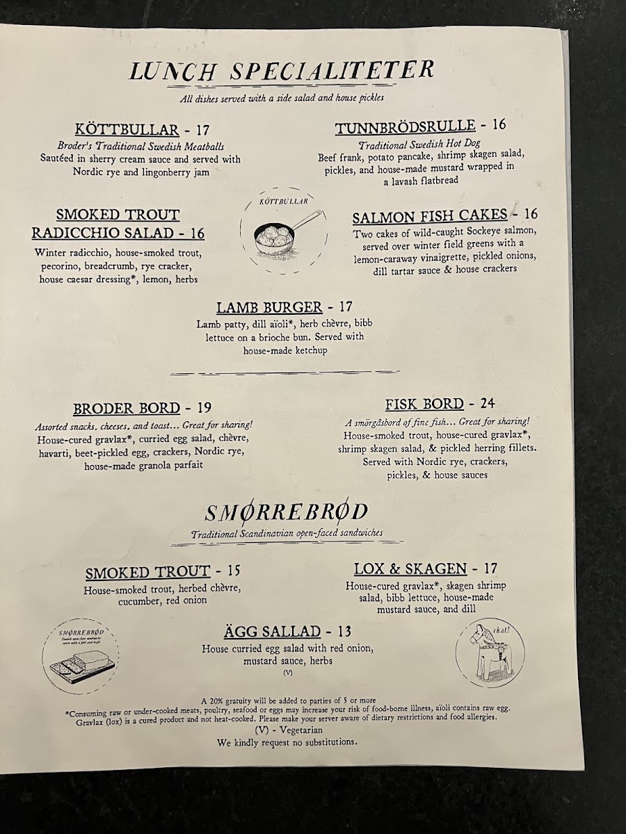 Lunch Specialiteter: Traditional Swedish offerings can be found here, including köttbullar (Swedish meatballs) served with sherry cream sauce, Nordic rye, and lingonberry jam. There are also salads with fresh seasonal greens and a lamb burger featuring dill aïoli and herb chèvre on a brioche bun.