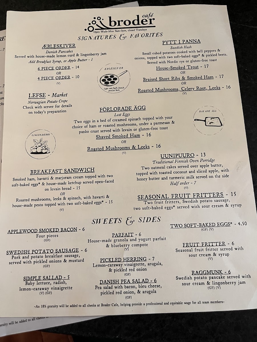 Sweets & Sides: This section includes options such as applewood smoked bacon, pork apple sausage served with pickled onions and mustard, seasonal fruit fritters with sour cream and syrup, and housemade granola and yogurt parfaits. Pickled herring is also available and changes daily.